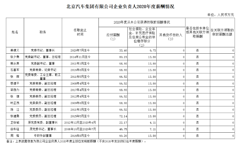 北京汽車集團有限公司企業負責人2020年度薪酬情況