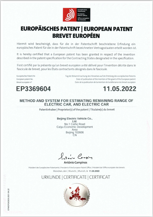 In this newly granted overseas patent, which has been applied to the ARCFOX cars, BAIC provides an electric vehicle range estimation and energy management method. It realizes the accurate estimation of the remaining range of the vehicle, solves the defects of the conventional estimation method with low accuracy, and allays consumer concerns. The patent has passed the examination procedures of WIPO (World Intellectual Property Organization) and the European Patent Office, both of which are recognized as highly innovative patents.