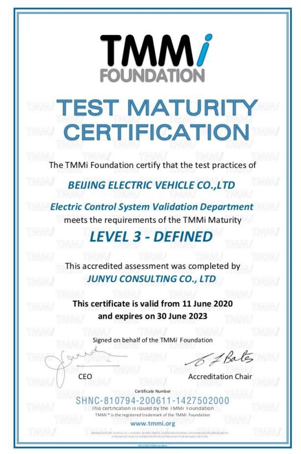 TMMi is an internationally authoritative evaluation model to test organization maturity and accordingly the TMMi certification is an extremely powerful qualification certification for software quality management. LG, Dell, HP and China Merchants Bank already received the certification. As the world’s first automaker receiving this award, this is an affirmation and recognition of BAIC Electric Vehicle’s decade-long concentration on all-electric development and pursuit of technological innovation.