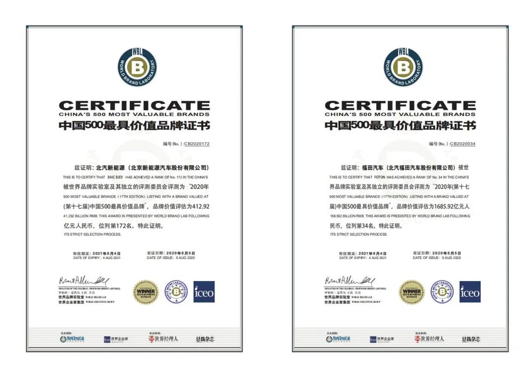 On August 5, 2020, World Brand Lab released the 17th China’s 500 Most Valuable Brands in 2020. BAIC achieved a growth of nearly 31% from the previous year, ranking the 18th with a brand value of RMB283.975 billion and the 3rd in the auto industry. BAIC Foton and BAIC BJEV were also on the list with excellent brand values.