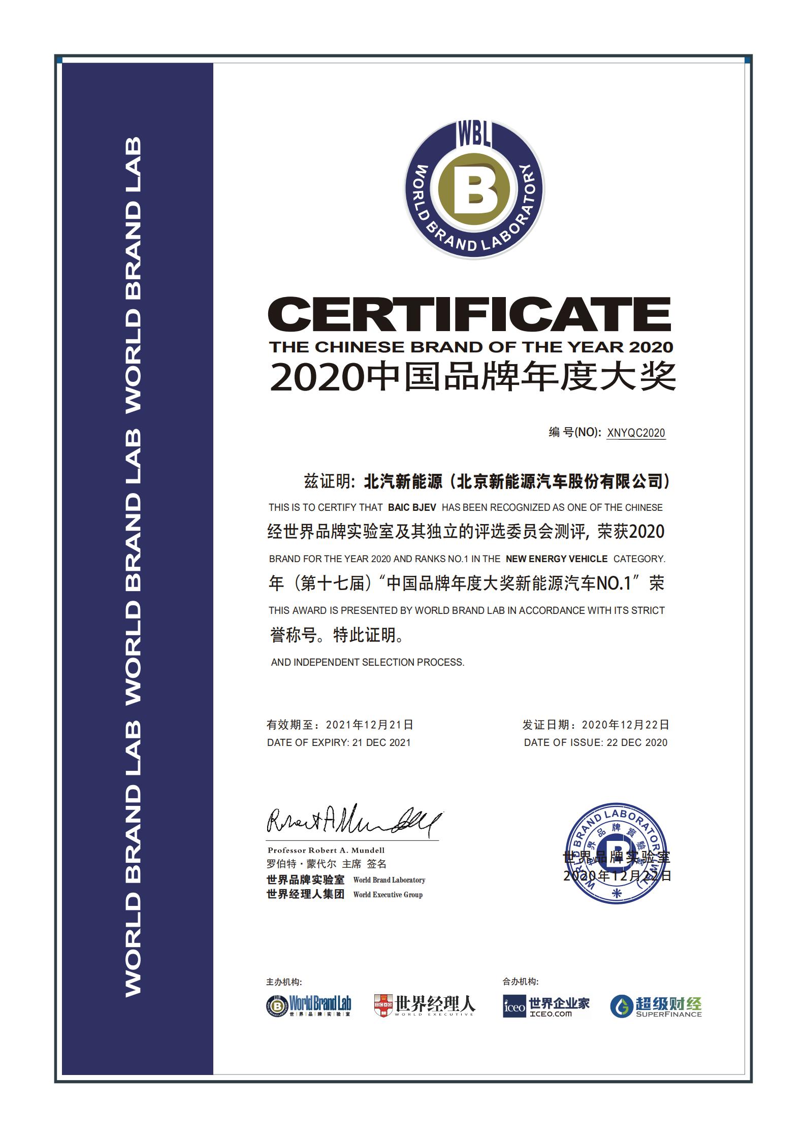 China Beijing, December 22nd 2020—Beijing Electric Vehicle Co., LTD (BAIC BJEV) is listed into 2020 Chinese Most Influential Brands (17th edition) as the sole new energy vehicle company. This highly recognized Chinese brand Oscar is organized and evaluated by World Brand Lab and its independent selection commission, which covers over 35 industrial leaders in 2020 such as Huawei, Air China and Xuzhou Construction Machinery Group.
