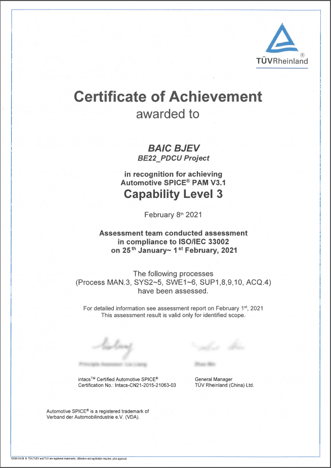 As a pioneer in independent R & D and manufacture of new energy vehicles, BAIC BJEV is committed to launch customer-oriented premium products, in which world-class auto software development system is indispensable. Following ISO26262 ASIL-D certificate and ASIL-C certificate in 2016, the company gears up to introduce ASPICE model and set up standard development processes in demands analysis, designs, testing and QA by combining ASPICE requirements, ISO26262 safety standards and years of self-development experiences. Due to strict quality control through review and KPI systems, ASPICE-based software development process, implementation guidance & templates and over 200 checklists, BAIC BJEV passed certificates L2 and L3 of TÜV Rheinland in June 2019 and 2021, involving 16 process areas such as system development & testing, software development & testing, project management, supplier supervision, configuration management, change management, QA, problem management and VDA.