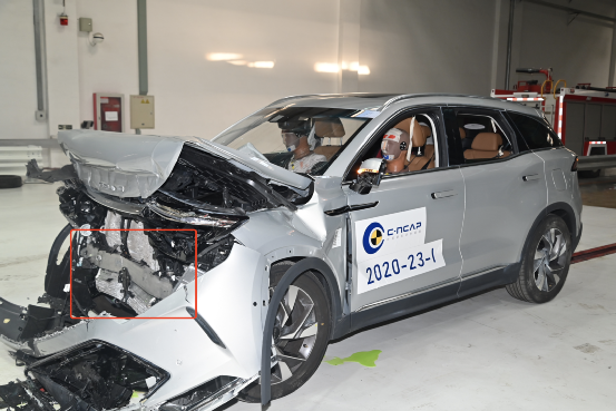 在正面100%重疊剛性壁障碰撞試驗中,BEIJING-X7覆蓋至輪胎位置的厚實鋁合金防撞梁及吸能盒緩沖結構設計,將撞擊力直接分化給車身的兩根縱梁,通過縱梁的逐級受控折彎通過,有效吸收正面碰撞的能量;在碰撞瞬間,主副駕安全帶點爆預緊,達到設定的限力值后安全帶力保持恒定,防止乘員胸部損傷。主副駕安全氣囊正常彈出,轉向管柱按設計方式潰縮,減小駕乘人員頭胸部所承受的撞擊力,使得車內乘員得到有效的保護。碰撞后,遠程救援系統ECALL自動接通,可第一時間通知救援力量趕赴現場。