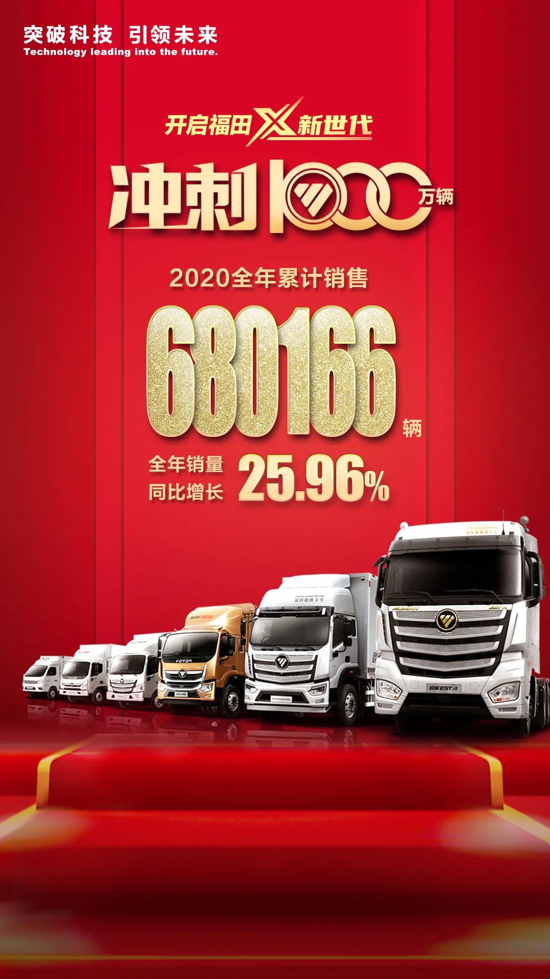 2020年,北汽福田“三年行動計劃”順利收官,同時提出開啟X新世代,為實時變革時代提供適應性產品和新模式。“X”代表不斷創新的變革基因,代表中國商用車未來的四大發展方向。2021年,北汽福田即將迎來產銷1000萬輛,躍升到一個新的發展高度。未來,北汽福田將在技術突破、產品升級、營銷模式、服務理念等方面引領行業發展,開啟中國商用車“X新世代”。