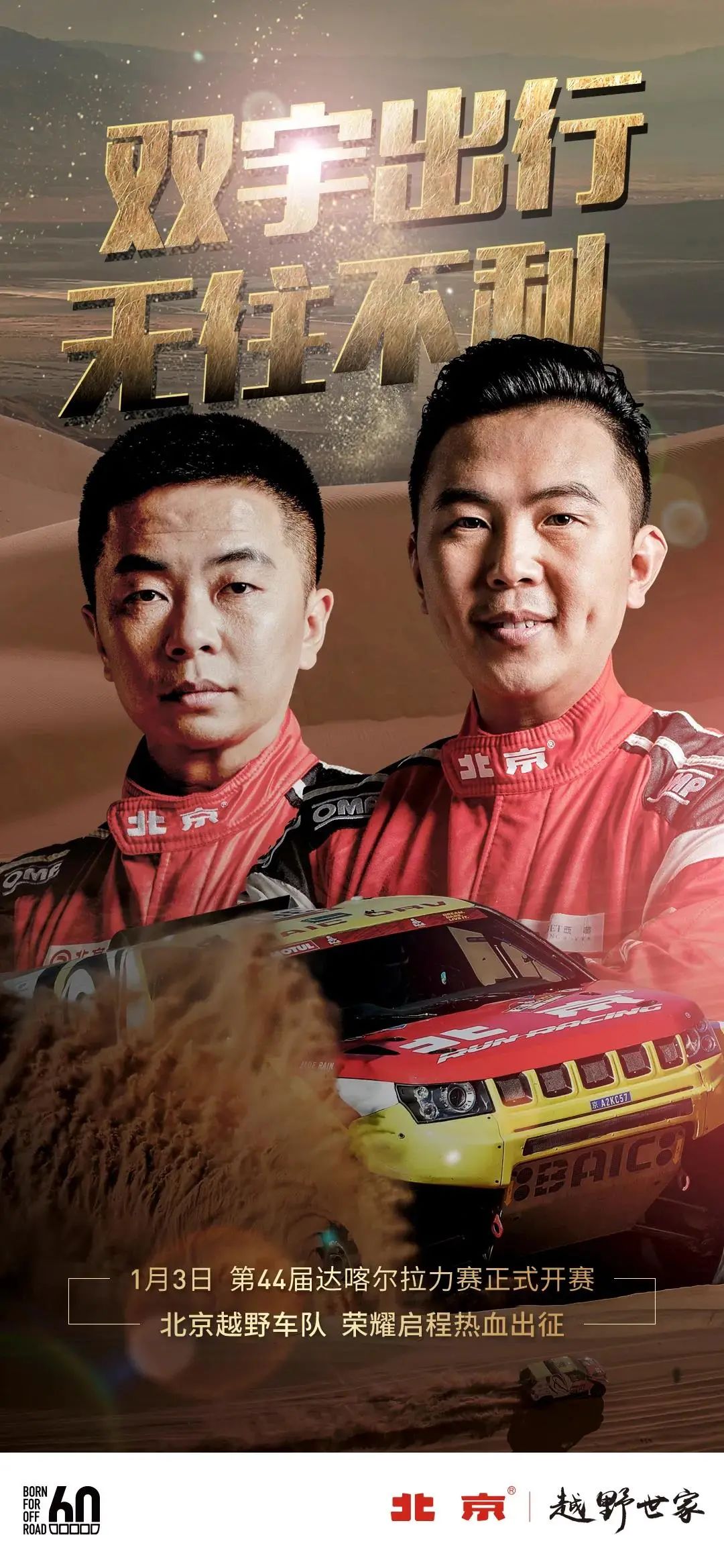 本屆賽事,北京越野車隊派出張國宇、潘宏宇兩員猛將參加。車手張國宇大賽經(jīng)驗豐富,曾斬獲諸多榮譽,領(lǐng)航員潘宏宇同樣擁有豐富的經(jīng)驗,此次二人攜手劍指大漠,“雙宇”合璧無往不利。另外,本次出戰(zhàn)的北京越野BJ40戰(zhàn)車,經(jīng)過特殊設(shè)計,整車重量分配更加平衡、動態(tài)操控更好響應(yīng)、發(fā)動機更耐久耐高溫。無論是戰(zhàn)風(fēng)沙、越山丘還是攀陡坡,BJ40動力十足,從容應(yīng)對達喀爾拉力賽的兇險路況,全方位為車手安全護航。此次參賽,北京越野車隊無懼挑戰(zhàn),已做好馳騁賽場的準備。